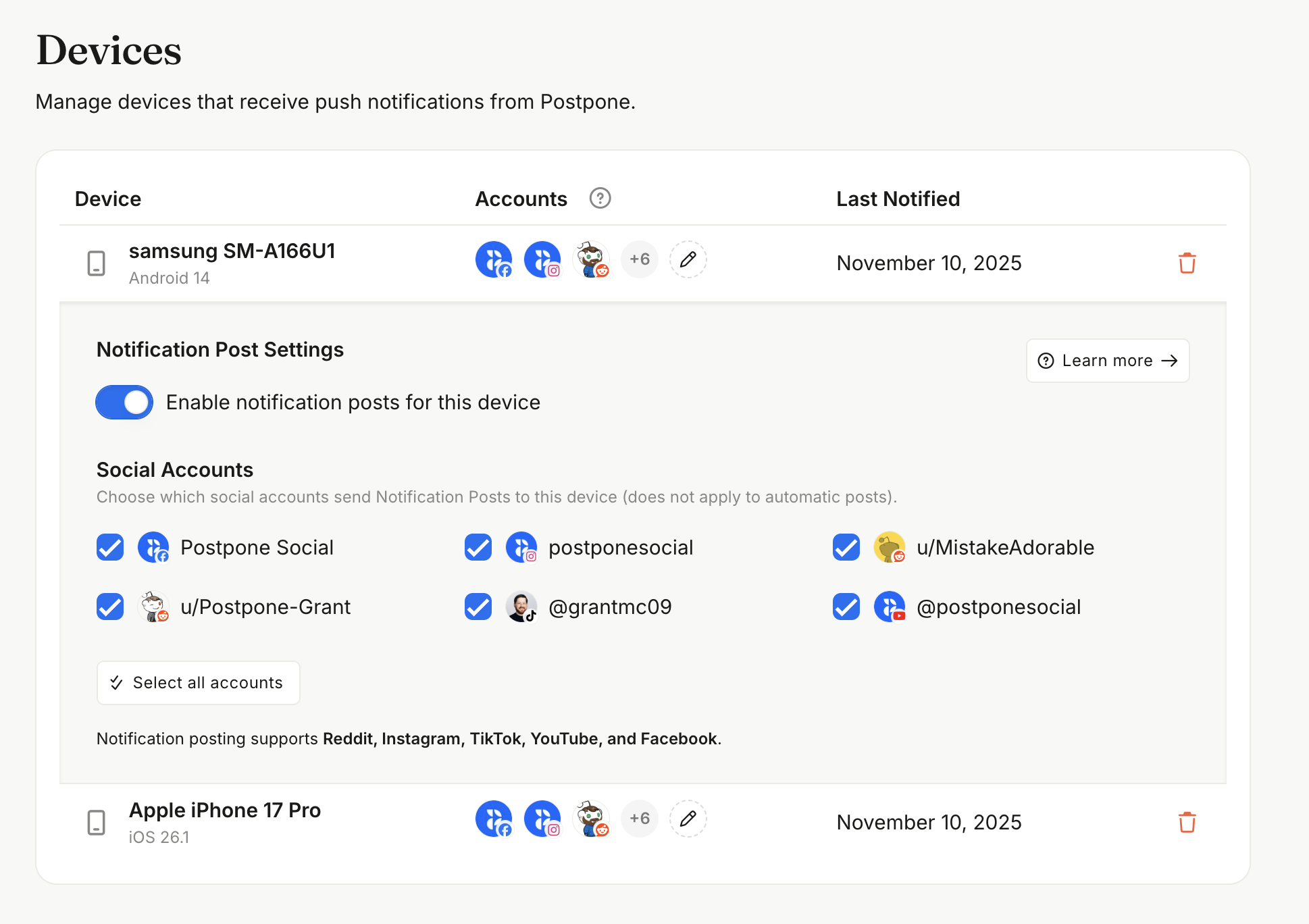 Postpone lets you assign specific social accounts to specific devices. Each device will only receive notifications for its assigned accounts—nothing else.